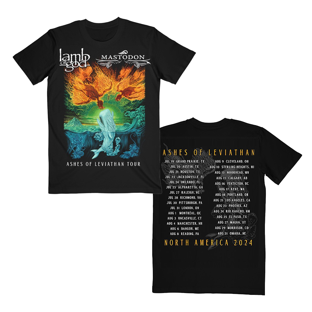 The Ashes of the Leviathan Itin Tee a crew neckline, short sleeves, 2024 North America itinerary on the back, and the legendary Lamb of God x Mastodon logos on the front.