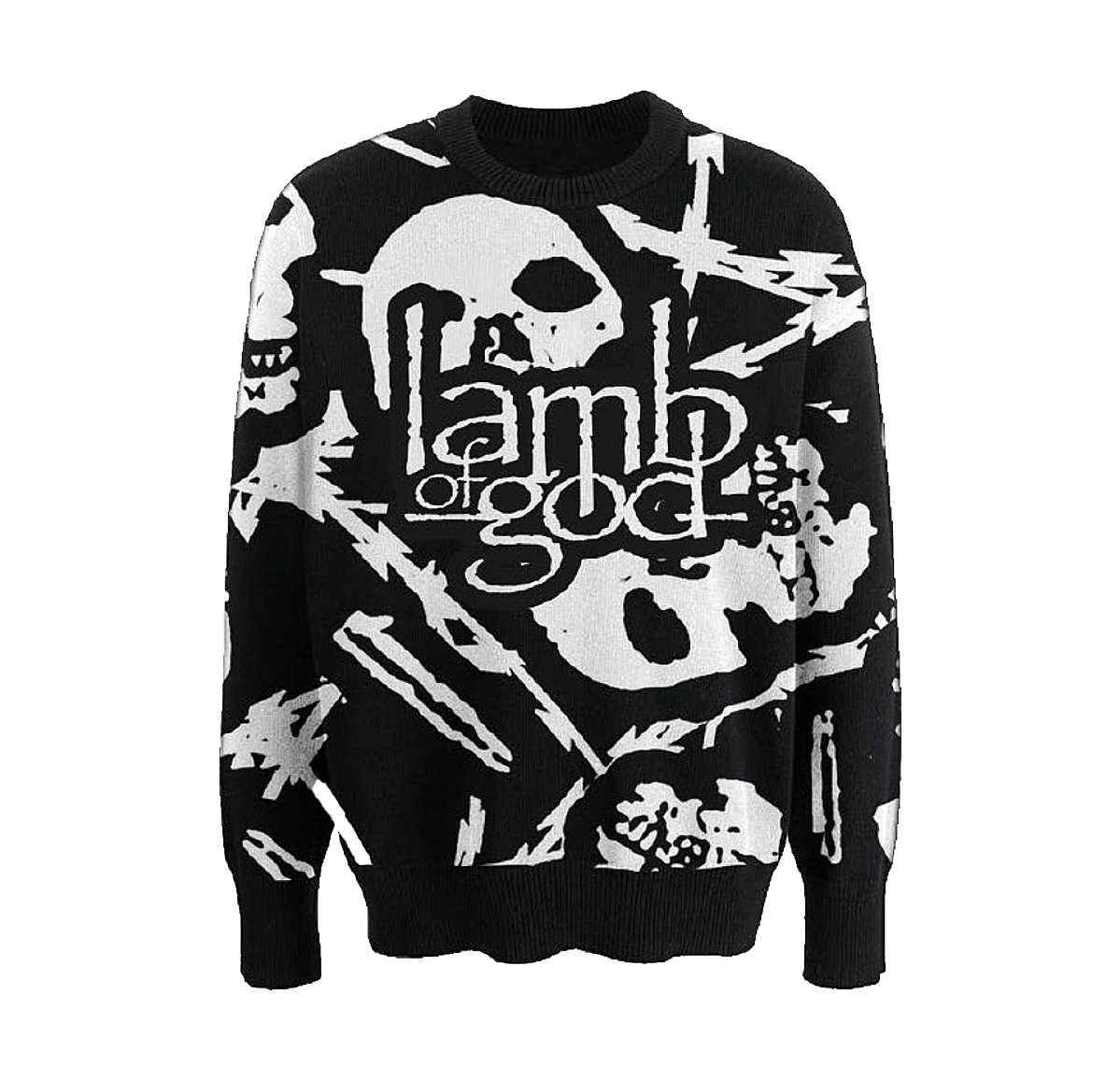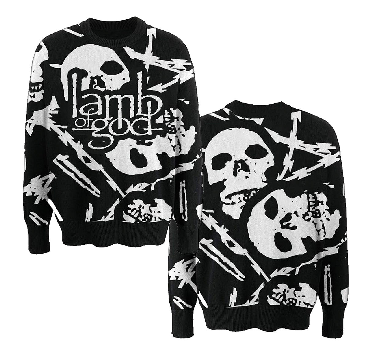 The Barbed Wire Skull Sweater features long sleeves, ribbed neckline, sleeves cuffs, luxe jaguar weave, woven neck label, and the legendary Lamb of God logo. Perfect for raising hell in the pit or repping the band on the streets.