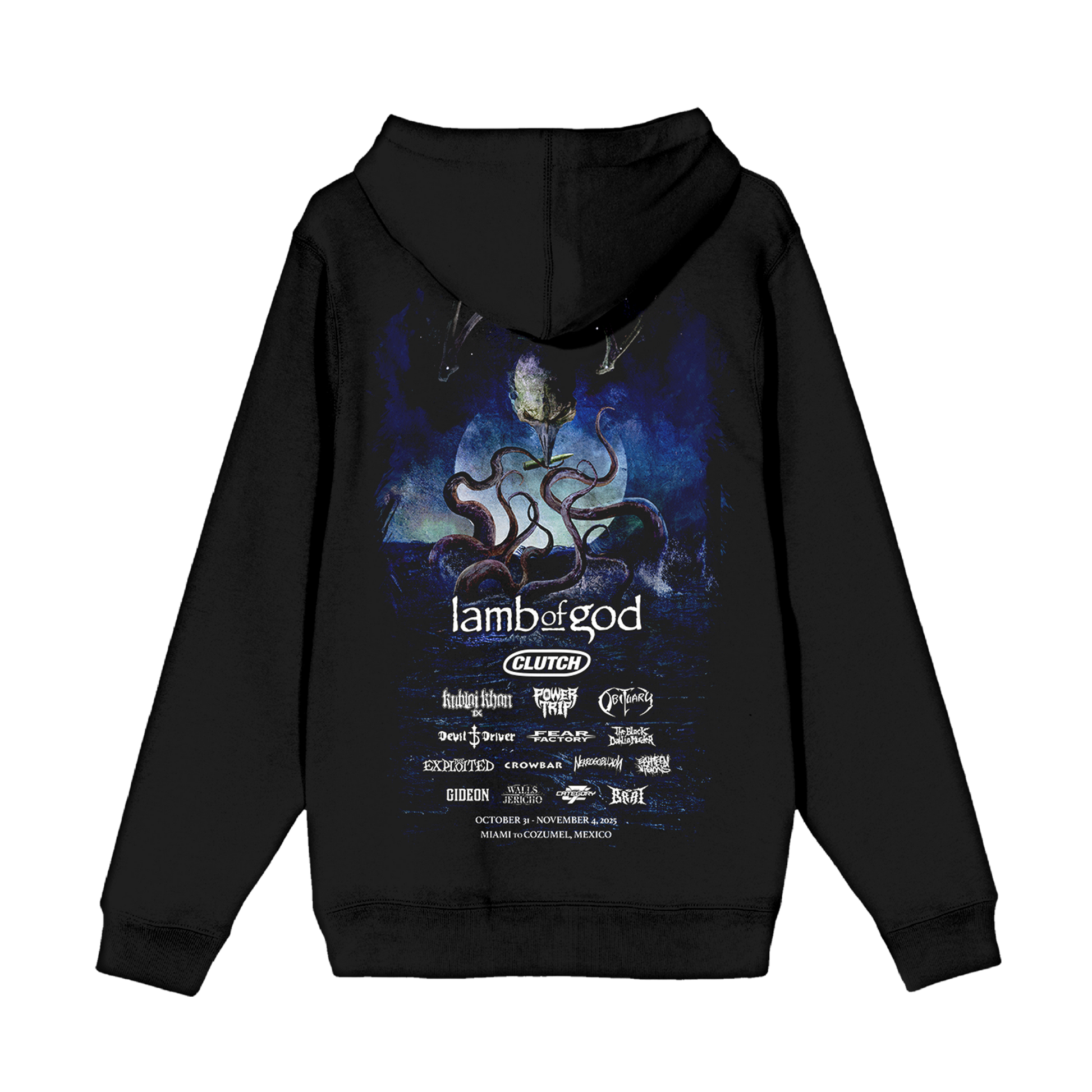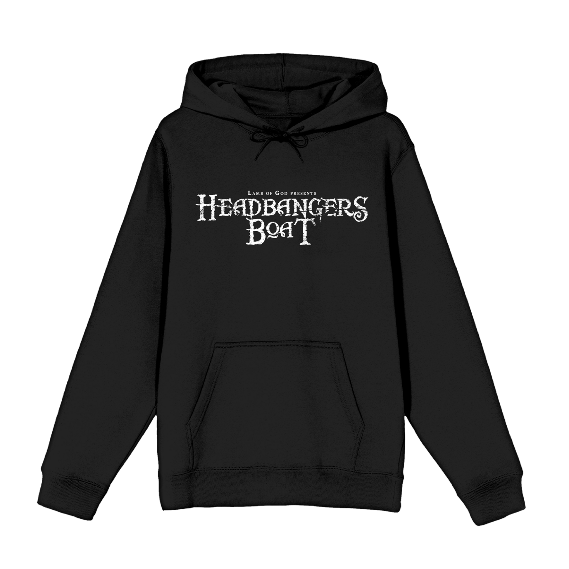 The HBB 2025 Lineup Hoodie features a classic front-zip closure and unisex fit, showcasing exclusive artwork inspired by the 2025 Headbangers Boat presented by Lamb of God.