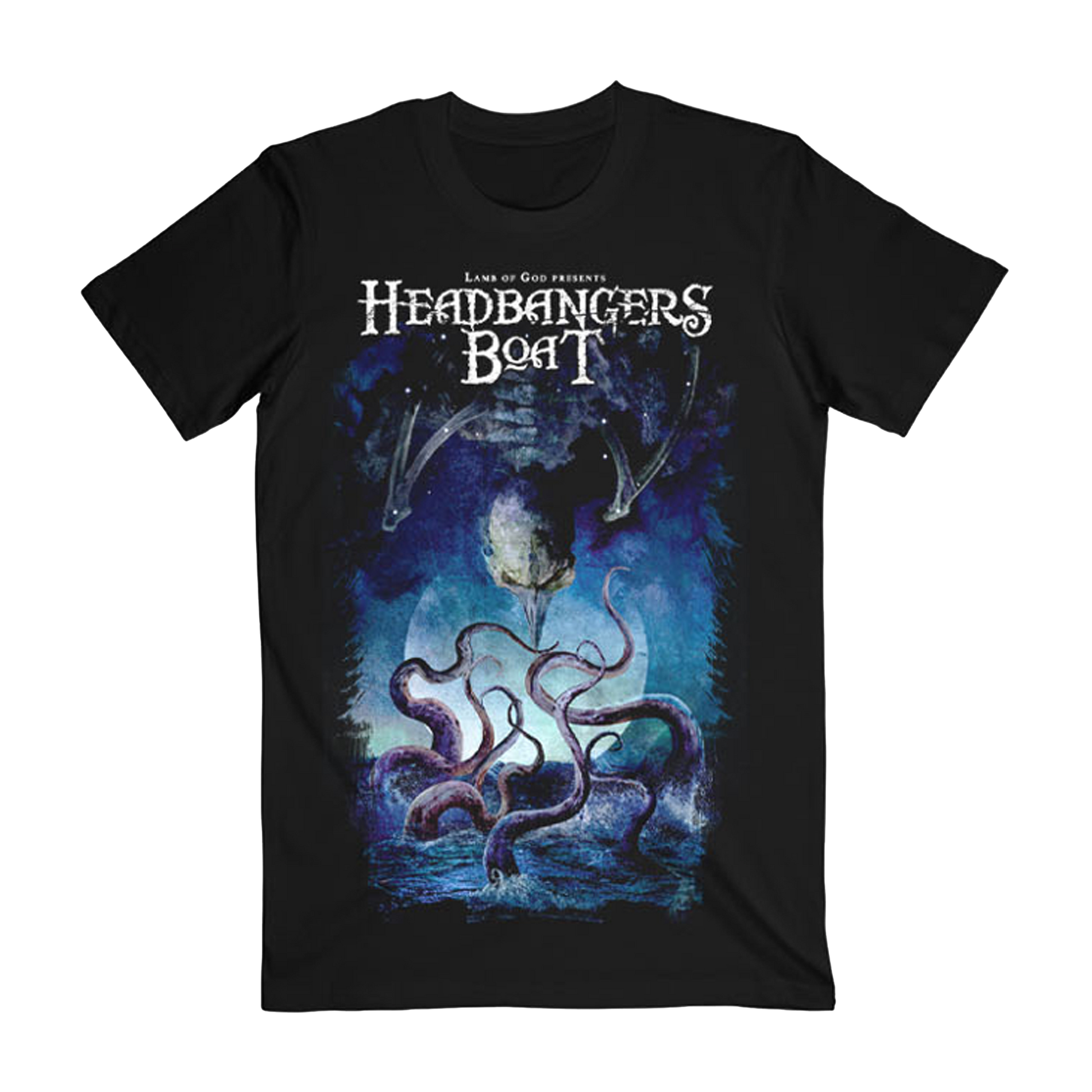 The HBB 2025 Lineup Tee features a classic crew neckline and unisex fit, with exclusive artwork inspired by the 2025 Headbangers Boat presented by Lamb of God.